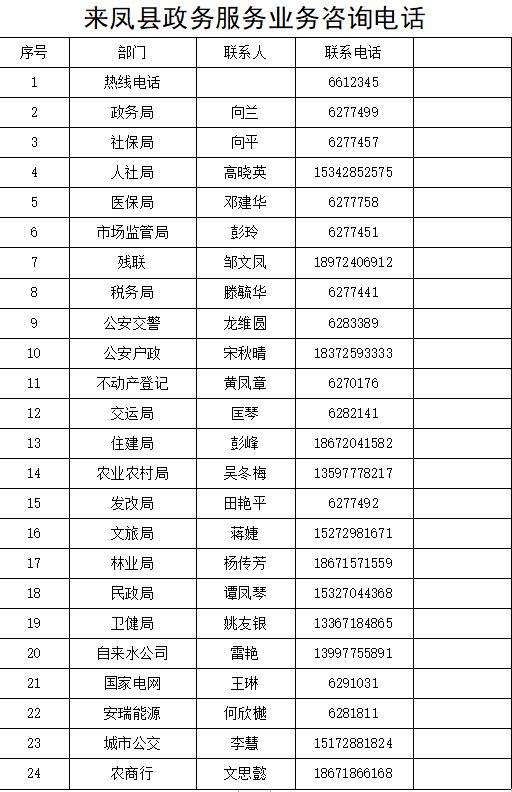 根據(jù)《省優(yōu)化營商環(huán)境領(lǐng)導(dǎo)小組關(guān)于建立“店小二”專線服務(wù)工作機(jī)制的通知》(鄂營商發(fā)〔2021〕5號(hào))和《恩施州優(yōu)化營商環(huán)境領(lǐng)導(dǎo)小組辦公室關(guān)于印發(fā)“店小二”專線服務(wù)工作任務(wù)清單的通知》(恩施州優(yōu)組辦發(fā)〔2021〕5號(hào))文件精神,完善企業(yè)和群眾反映訴求渠道,提升企業(yè)群眾滿意度和獲得感,現(xiàn)將來鳳縣“店小二”專線電話公布如下。