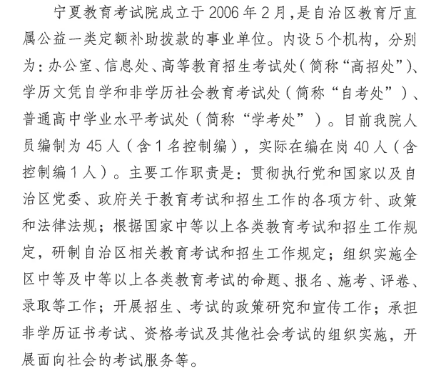 負(fù)責(zé)組織實(shí)施全區(qū)自學(xué)考試管理工作,自學(xué)考試專業(yè)設(shè)置、課程設(shè)置、論文答辯、畢業(yè)生資格審查、畢業(yè)證發(fā)放管理工作,全區(qū)英語等級考試、計算機(jī)等級考試、大學(xué)英語四六級口語考試、成人學(xué)士學(xué)位考試、同等學(xué)歷人員申請碩士學(xué)位課程考試、全國中小學(xué)教師資格考試筆試和面試管理工作;根據(jù)國家相關(guān)考試政策規(guī)定,負(fù)責(zé)研制我區(qū)相關(guān)考試政策規(guī)定,開展考試政策宣傳培訓(xùn)工作。