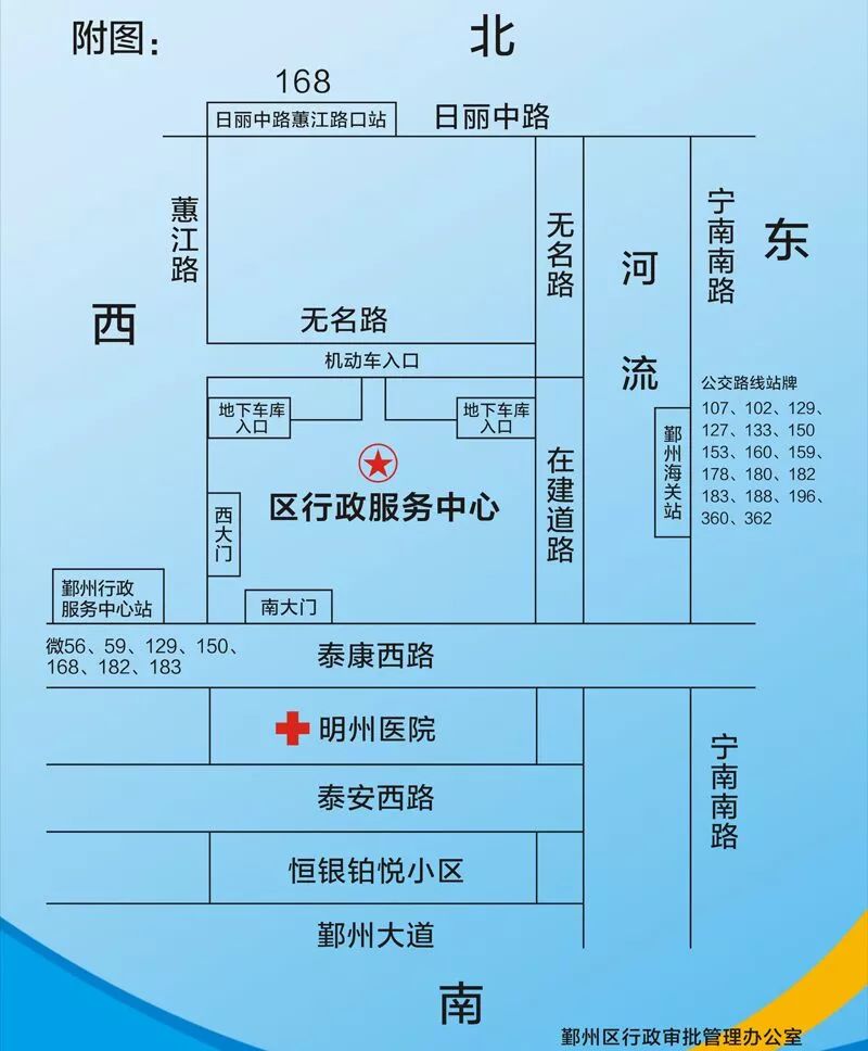 區(qū)行政服務中心新址毗鄰寧南南路,公共交通較為便捷,市民可乘坐微56、59、129、150、168、182、183至明州醫(yī)院北下車,也可乘坐102、107、127、129、133、150、153、159、160、178、180、182、183、188、196、360、362至海關站下車即可。