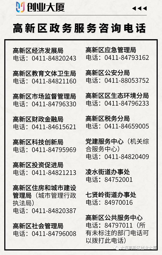 大連高新區(qū)政務(wù)服務(wù)中心咨詢電話 政務(wù)服務(wù)中心1號(hào)樓導(dǎo)服臺(tái):0411-84797011 政務(wù)服務(wù)中心2號(hào)樓導(dǎo)服臺(tái):0411-84820595,高新區(qū)市場(chǎng)監(jiān)督管理局電話:0411-84796330