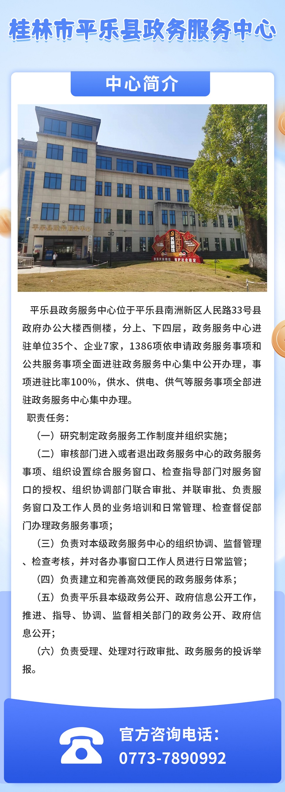 辦公地址:桂林市平樂縣南洲新區(qū)人民路33號縣政府辦公大樓西側(cè)樓縣政務(wù)服務(wù)中心