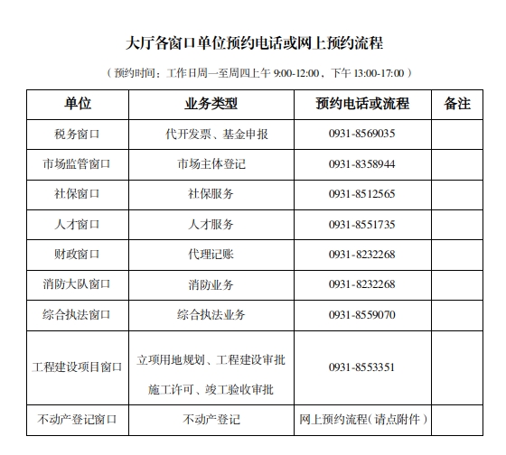 凡進(jìn)駐高新區(qū)政務(wù)服務(wù)大廳的政務(wù)服務(wù)事項(xiàng)均可預(yù)約辦理,亦可在甘肅政務(wù)服務(wù)網(wǎng)查詢。如有疑問,可撥打0931-8270359咨詢。