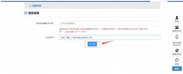 進(jìn)入【核名信息】校驗,按照提示準(zhǔn)確輸入《名稱預(yù)先核準(zhǔn)通知書》文號(或《告知書》文號)和企業(yè)名稱。并點擊“下一步”。
