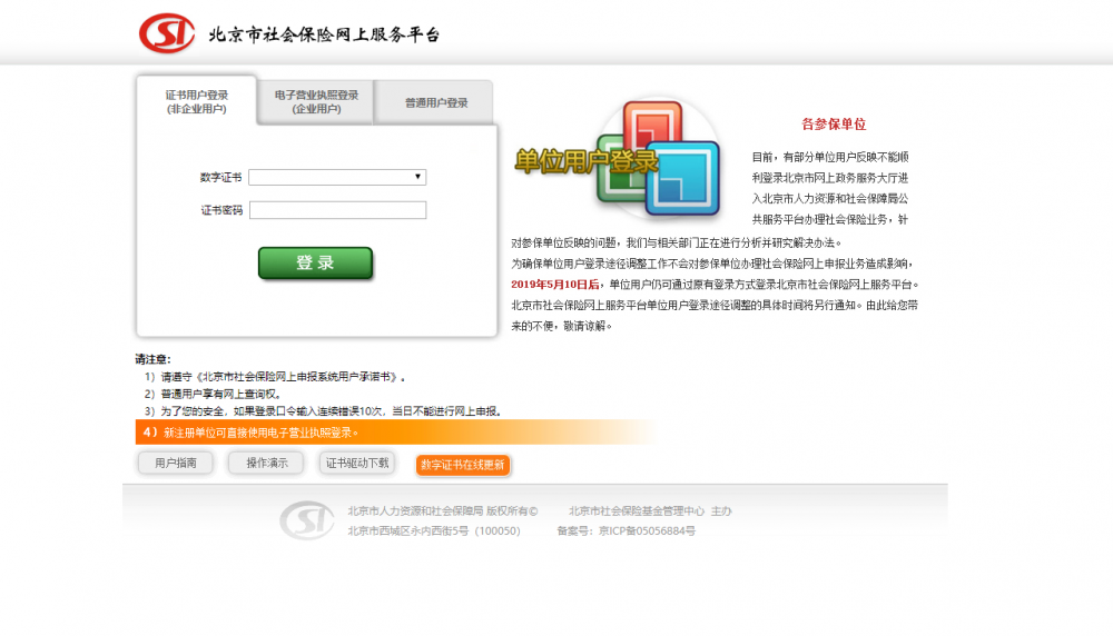 1.2北京市政務(wù)服務(wù)大廳登錄(2019年4月25日開始試用,5月10日正式啟用,凡已申領(lǐng)數(shù)字證書單位均可直接登錄,無需另行注冊)