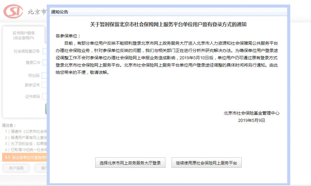 3.2北京市政務(wù)服務(wù)大廳登錄(2019年4月25日開始試用,5月10日正式啟用,參保企業(yè)需通過北京市政務(wù)服務(wù)大廳重新注冊后以該方式登錄)