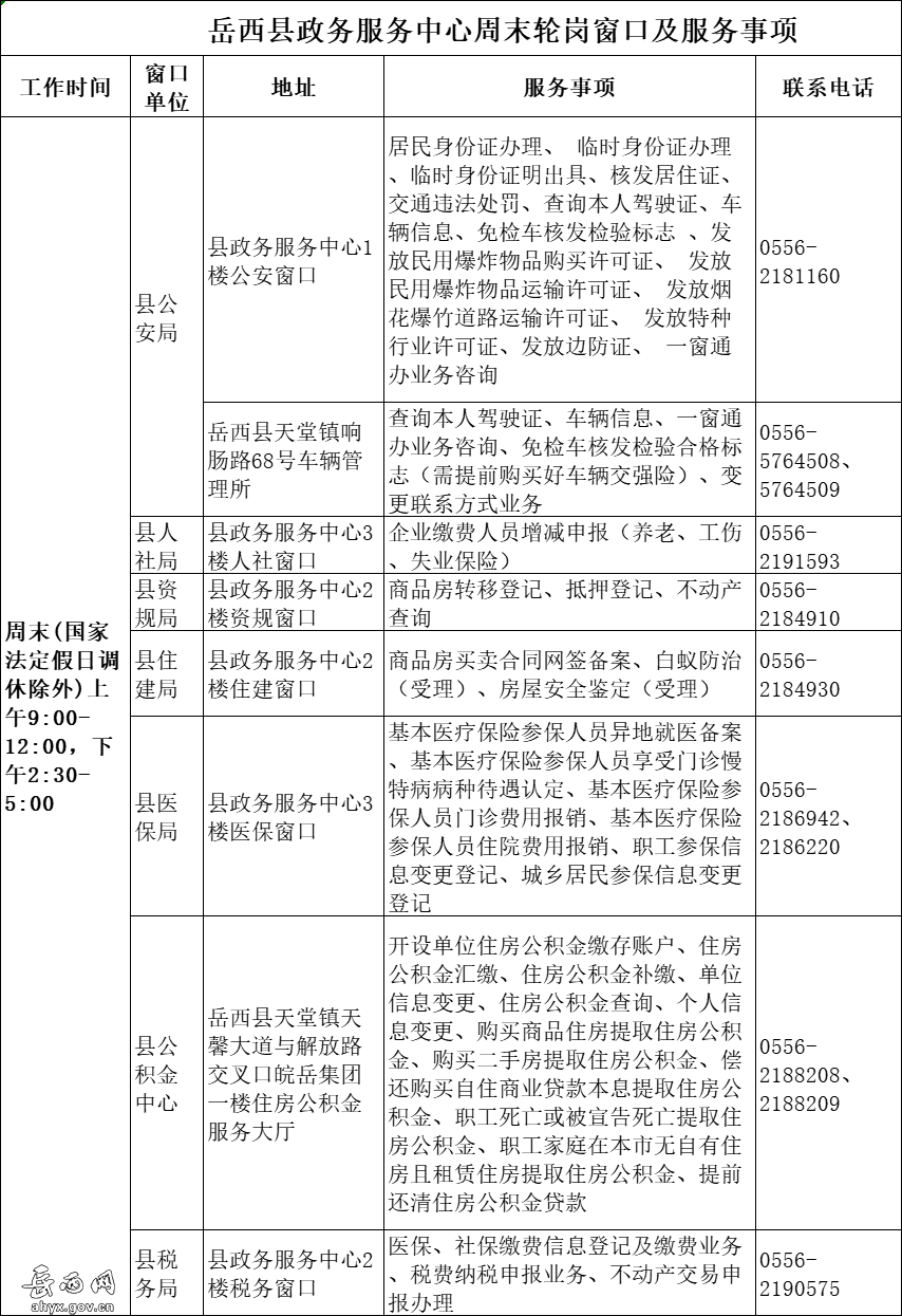 附件:岳西縣政務(wù)服務(wù)中心周末輪崗窗口及服務(wù)事項(xiàng)