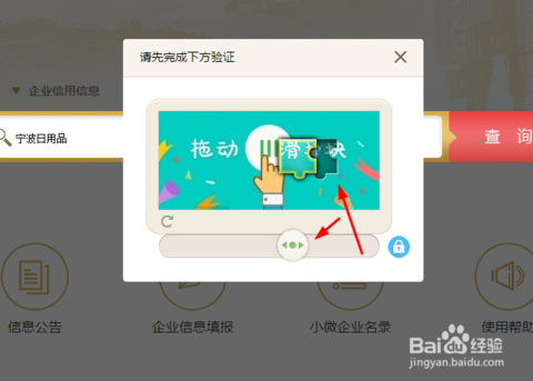 輸入公司名稱,點擊搜索,彈出驗證窗口,拖動完成驗證即可。