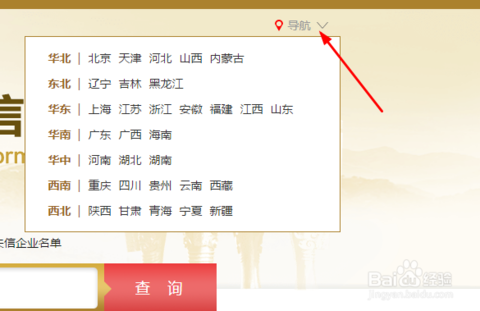 鼠標移到右上角的【導(dǎo)航】圖標,顯示出全國各個省份的連接。查詢前先點擊進入相應(yīng)的省份,不然會搜索不到哦。