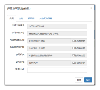 當(dāng)行政許可信息發(fā)生變更(不包含注銷(xiāo)、吊銷(xiāo)信息)點(diǎn)擊“修改”按鈕選擇“變更”標(biāo)簽頁(yè),可對(duì)行政許可信息進(jìn)行修改,默認(rèn)情況各項(xiàng)信息不可編輯,勾選“是否有變更”選擇框可進(jìn)行編輯,選擇變更日期后點(diǎn)擊“公示”按鈕可進(jìn)行公示。