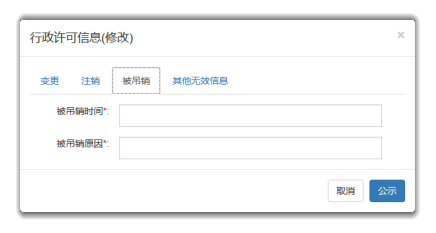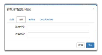 當(dāng)行政許可信息注銷(xiāo)后需要添加注銷(xiāo)信息,點(diǎn)擊“修改”按鈕選擇“注銷(xiāo)”標(biāo)簽頁(yè),輸入注銷(xiāo)時(shí)間、注銷(xiāo)原因后點(diǎn)擊“公示”按鈕進(jìn)行公示,公示成功后此行政許可信息狀態(tài)將變?yōu)椤盁o(wú)效”。