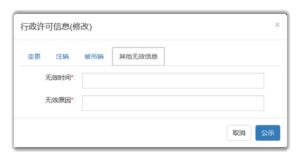 當(dāng)行政許可信息因其他原因變?yōu)闊o(wú)效或因失誤填寫(xiě)錯(cuò)誤需要添加其他無(wú)效信息,點(diǎn)擊“修改”按鈕選擇“其他無(wú)效信息”標(biāo)簽頁(yè),輸入無(wú)效時(shí)間、無(wú)效原因后點(diǎn)擊“公示”按鈕進(jìn)行公示,公示成功后此行政許可信息狀態(tài)將變?yōu)椤盁o(wú)效”。