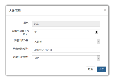 點(diǎn)擊“新增認(rèn)繳信息”按鈕,彈出編輯窗口,如實(shí)填寫(xiě)股東認(rèn)繳信息。