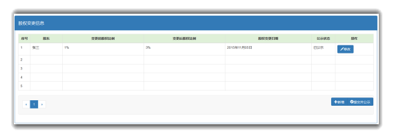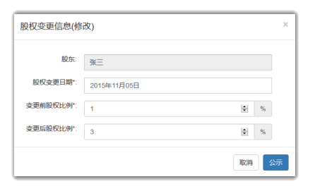 當(dāng)股東股權(quán)變更信息在首次公示后再次發(fā)送變更后需要進(jìn)行修改,點(diǎn)擊記錄“修改”按鈕,可修改除了股東姓名外的信息,確認(rèn)無(wú)誤后點(diǎn)擊“公示”按鈕進(jìn)行公示。