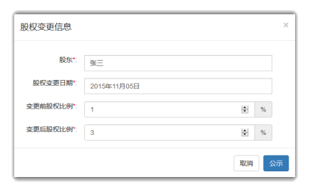 點(diǎn)擊“新增股東”按鈕,彈出編輯窗口,如實(shí)填寫(xiě)股東股權(quán)變更信息,并點(diǎn)擊“公示”按鈕。
