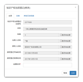 當(dāng)知識(shí)產(chǎn)權(quán)出質(zhì)登記信息發(fā)生變更(不包含注銷(xiāo)、吊銷(xiāo)信息)點(diǎn)擊“修改”按鈕選擇“變更”標(biāo)簽頁(yè),可對(duì)知識(shí)產(chǎn)權(quán)出質(zhì)登記信息進(jìn)行修改,默認(rèn)情況各項(xiàng)信息不可編輯,勾選“是否有變更”選擇框可進(jìn)行編輯,選擇變更日期后點(diǎn)擊“公示”按鈕可進(jìn)行公示。