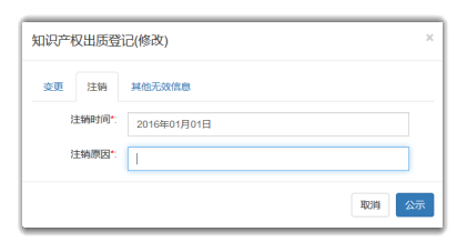 當(dāng)知識(shí)產(chǎn)權(quán)出質(zhì)登記信息注銷(xiāo)后需要添加注銷(xiāo)信息,點(diǎn)擊“修改”按鈕選擇“注銷(xiāo)”標(biāo)簽頁(yè),輸入注銷(xiāo)時(shí)間、注銷(xiāo)原因后點(diǎn)擊“公示”按鈕進(jìn)行公示,公示成功后此知識(shí)產(chǎn)權(quán)出質(zhì)登記信息狀態(tài)將變?yōu)椤盁o(wú)效”。