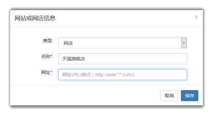 點(diǎn)擊“新增”按鈕,彈出編輯窗口,選擇類(lèi)型“網(wǎng)站”或“網(wǎng)店”,再填寫(xiě)網(wǎng)站或網(wǎng)店名稱(chēng),然后填寫(xiě)網(wǎng)址(請(qǐng)輸入標(biāo)準(zhǔn)格式網(wǎng)址,已http://或https://開(kāi)頭),最后點(diǎn)擊“保存”按鈕,保存成功后頁(yè)面自動(dòng)關(guān)閉。