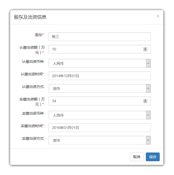 點(diǎn)擊“新增”按鈕,彈出編輯窗口。如實(shí)填寫(xiě)股東及其出資信息后點(diǎn)擊“保存”按鈕,保存成功后本頁(yè)面將自動(dòng)關(guān)閉。