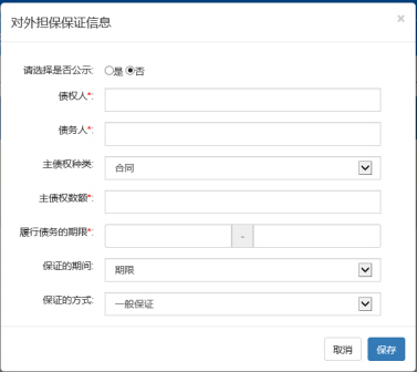 點(diǎn)擊“新增”按鈕,彈出編輯窗口,企業(yè)如實(shí)填寫(xiě)年報(bào)年度內(nèi)企業(yè)對(duì)外提供保證擔(dān)保信息,點(diǎn)擊“保存”按鈕,成功后頁(yè)面自動(dòng)關(guān)閉。