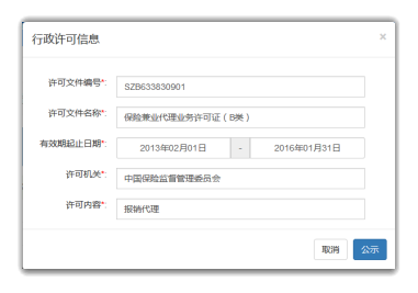 點(diǎn)擊“新增”按鈕,彈出編輯窗口,如實(shí)填寫(xiě)行政許可信息,點(diǎn)擊下圖“公示”按鈕,保存成功后頁(yè)面自動(dòng)關(guān)閉。