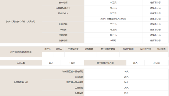 7、企業(yè)從業(yè)人數(shù)、資產(chǎn)總額、負(fù)債總額、對(duì)外提供保證擔(dān)保、所有者權(quán)益合計(jì)、營(yíng)業(yè)總收入、主營(yíng)業(yè)務(wù)收入、利潤(rùn)總額、凈利潤(rùn)、納稅總額信息。
