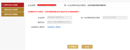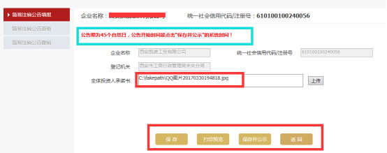 注:公告期為45個(gè)自然日,公告開(kāi)始時(shí)間是點(diǎn)擊“保存并公示”的系統(tǒng)時(shí)間!