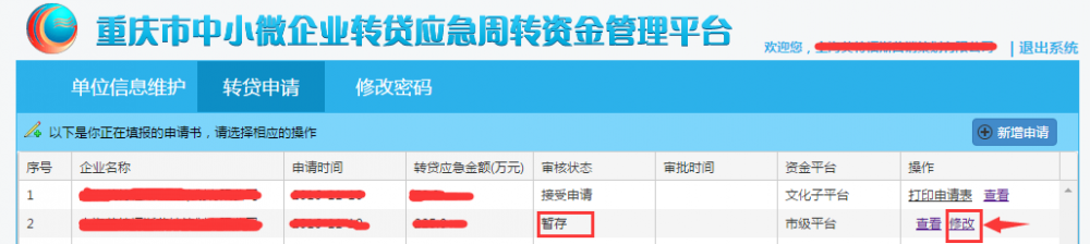 企業(yè)全部填寫完成后可以點(diǎn)擊“暫存”按鈕,暫存狀態(tài)是未提交轉(zhuǎn)貸申請(qǐng)信息的未提交,企業(yè)可以進(jìn)行修改操作,列表顯示如圖所示