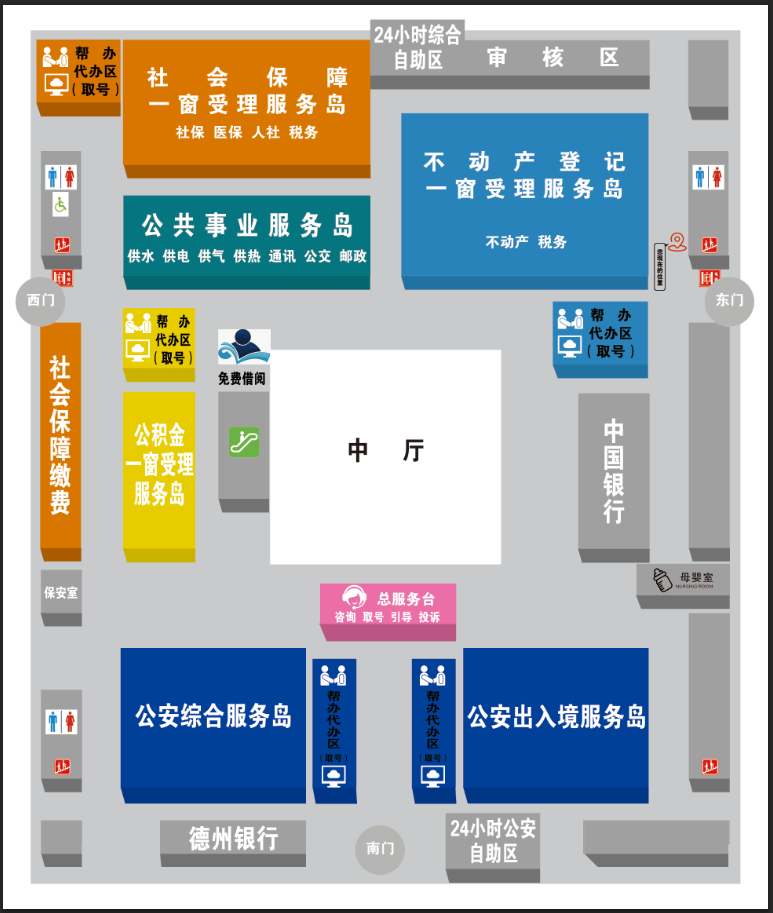 不動產(chǎn)登記一窗受理區(qū),人社、社保、醫(yī)保一窗受理區(qū),公積金一窗受理區(qū)。