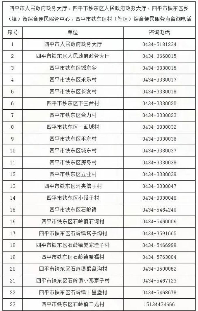 為進(jìn)一步強(qiáng)化為民服務(wù)意識(shí)、暢通為民服務(wù)渠道,滿足廣大人民群眾的辦事需求,提高為民辦事效率,打通市、區(qū)、鄉(xiāng)鎮(zhèn)、村社區(qū)四級(jí)便民服務(wù)網(wǎng)絡(luò),切實(shí)做好解民憂、惠民生、凝民心、聚民力工作,現(xiàn)將四平市人民政府政務(wù)大廳、四平市鐵東區(qū)人民政府政務(wù)大廳、四平市鐵東區(qū)鄉(xiāng)(鎮(zhèn))街綜合便民服務(wù)中心、四平市鐵東區(qū)村(社區(qū))綜合便民服務(wù)點(diǎn)咨詢電話進(jìn)行公示(見下表)。