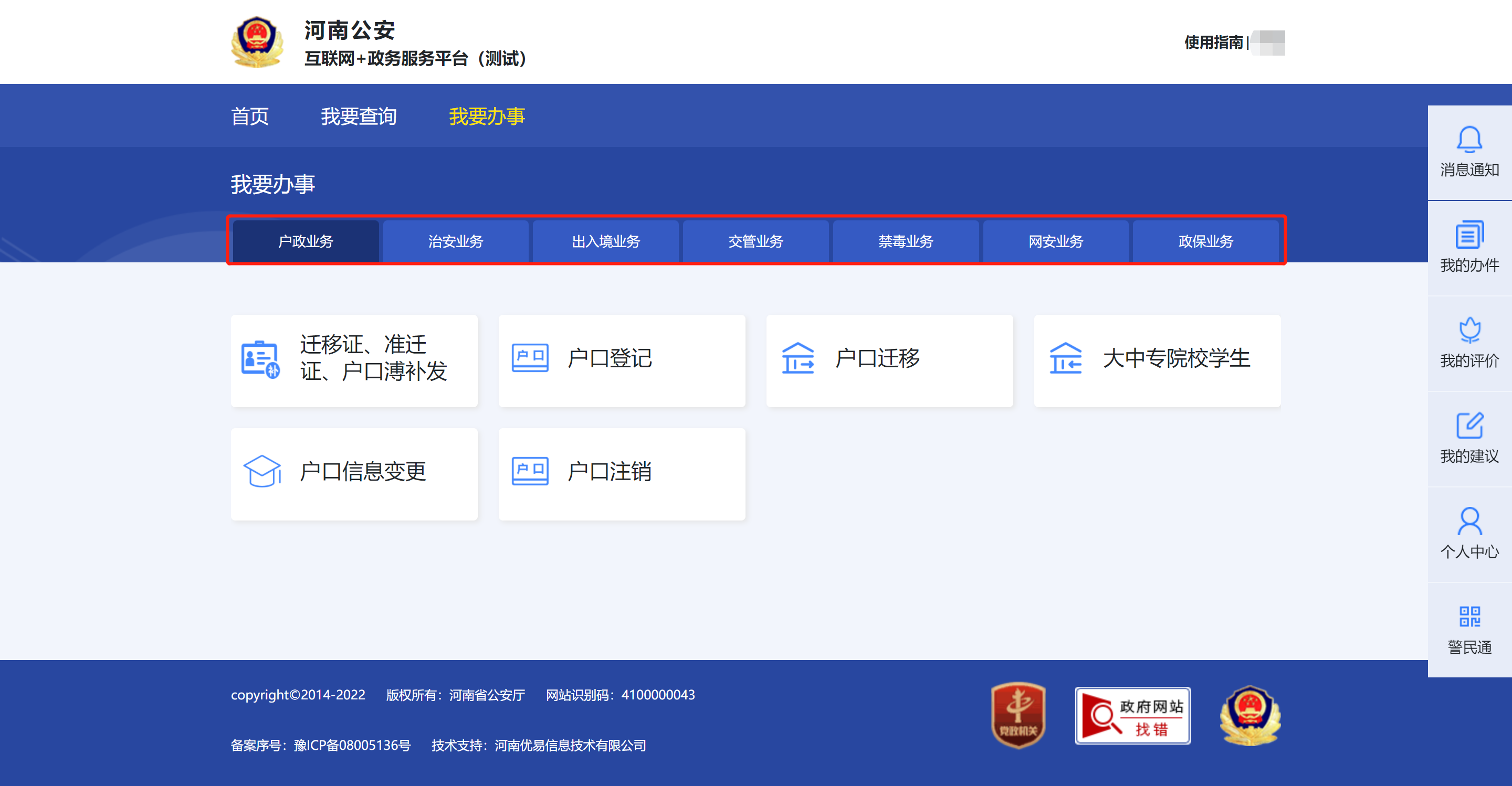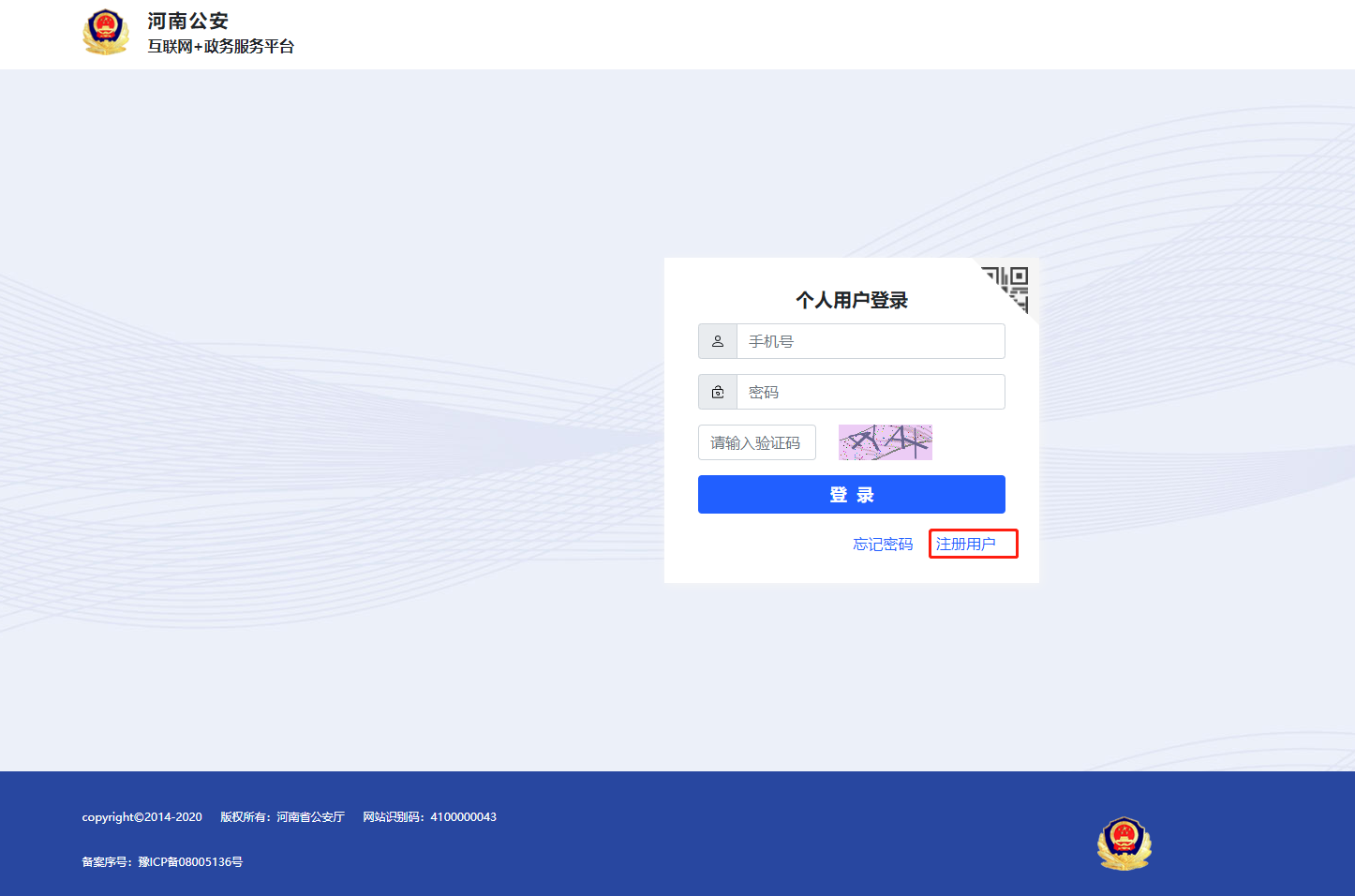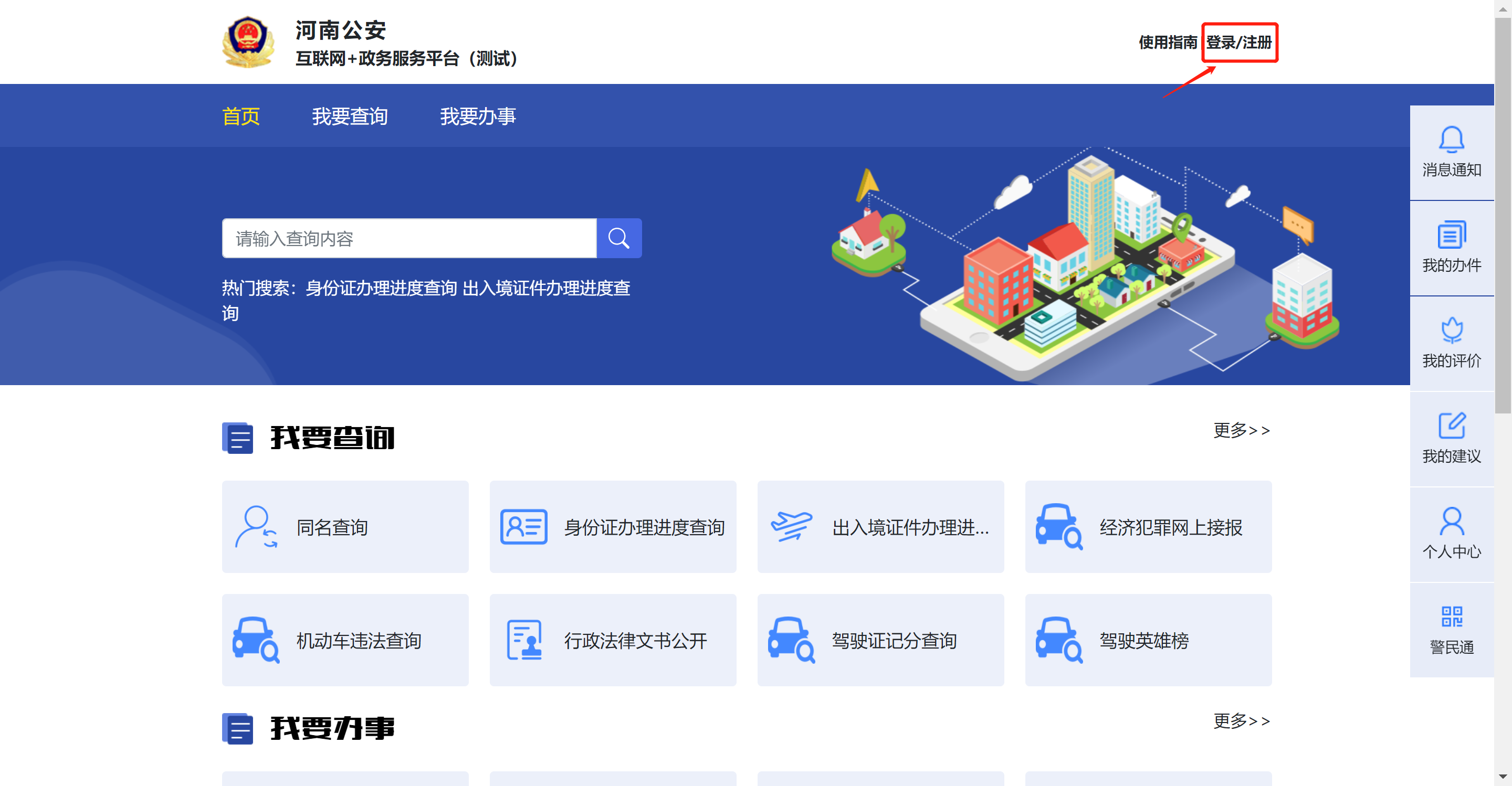 1 進(jìn)入河南公安互聯(lián)網(wǎng)+政務(wù)服務(wù)平臺,點(diǎn)擊導(dǎo)航欄右上角“登錄/注冊”。