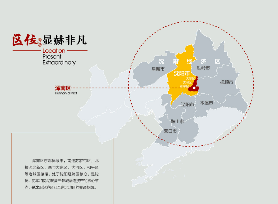 渾南區(qū)位獨(dú)特,是連通八方的樞紐之地。這里戰(zhàn)略位置突出,渾南地處東北亞經(jīng)濟(jì)圈和環(huán)渤海經(jīng)濟(jì)圈的中心區(qū)域,是沈撫、沈本和沈遼鞍營(yíng)三條城際連接帶的核心節(jié)點(diǎn),是中日、中韓、中俄交流的樞紐關(guān)鍵;這里通達(dá)能力強(qiáng)大,坐擁東北地區(qū)最大的航空港沈陽(yáng)桃仙國(guó)際機(jī)場(chǎng)和高鐵客站沈陽(yáng)南站,民航、高鐵、高速、國(guó)道、城市軌道交通互通互聯(lián),占據(jù)沈陽(yáng)經(jīng)濟(jì)區(qū)核心位置,是聯(lián)通沈陽(yáng)現(xiàn)代化都市圈的交通樞紐。