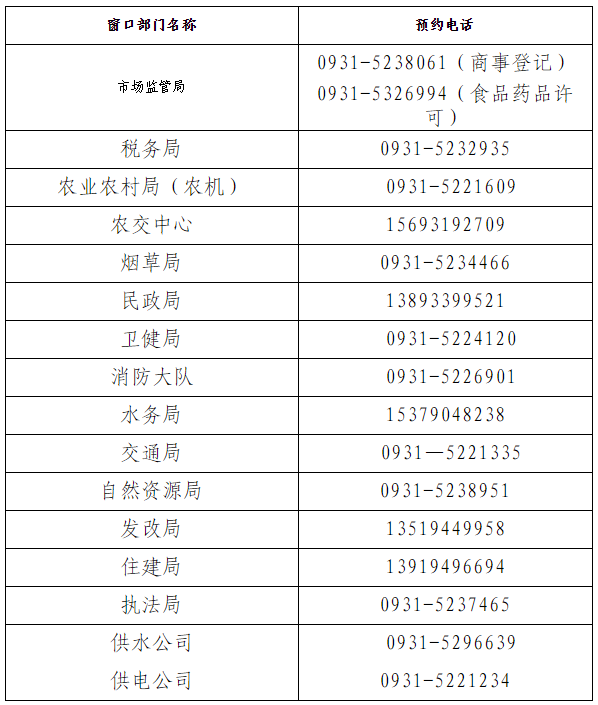 榆中縣政務(wù)服務(wù)大廳各窗口預(yù)約電話